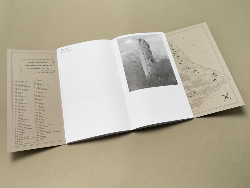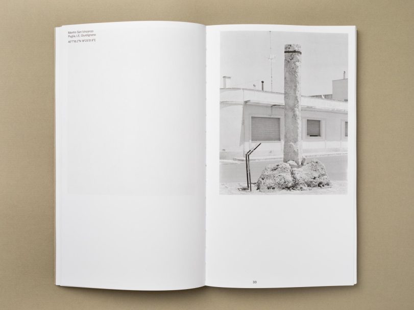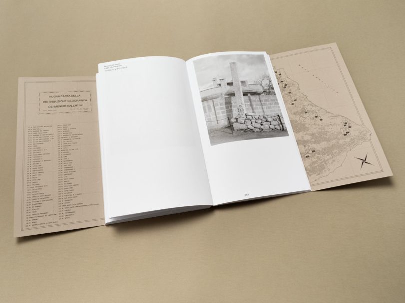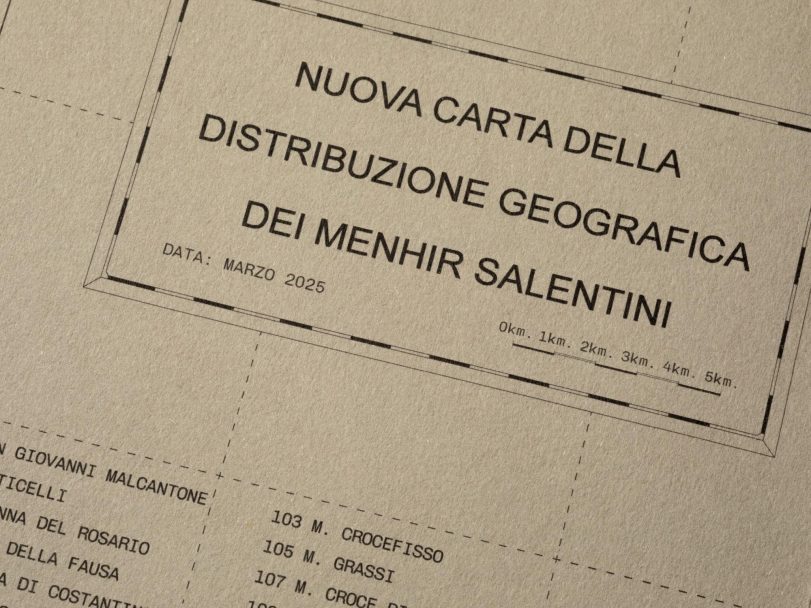 “Questo inventario elenca, ordinati per longitudine da oriente a occidente, i menhir che ho fotografato in Salento tra il 2021 e il 2022. Sono pietrefitte stratificate, spesso cristianizzate, inglobate in aiuole, rotonde e arredi urbani, assediate dalla contemporaneità ma non vinte: basta la loro energia di pietre a suscitare da secoli – da millenni secondo alcuni – il rispetto e la cura da parte delle comunità locali e a trasformare luoghi casuali in posti precisi. Come spilli conficcati su una mappa, i menhir servono a non perdersi, rispondendo a una innata volontà collettiva di comprendere una natura altrimenti indecifrabile e orientarsi nel ‘caos del mondo’. Rispecchiandosi nella sagoma lontana di un menhir, il viandante misura i passi necessari per raggiungerlo: definisce lo spazio e il tempo e così capisce il paesaggio che attraversa.” dal testo di Giuseppe Fanizza